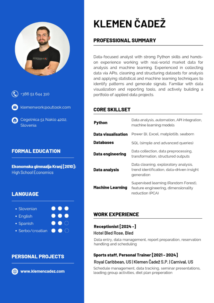 Throughout my life, I’ve been highly analytical and detail-oriented, consistently relying on data to guide my decisions. From using software like Pokertracker along with probability and statistics while playing proffesional poker, to analyzing market data for smarter trading decisions, data has always played a central role in how I think and operate.