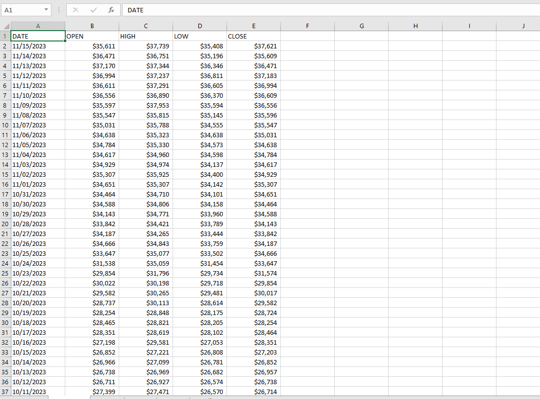 The first step for my project was to find a database or a csv file that contains historical BTC/USD data from 2008 (when bitcoin was created) to the current date (16.11.2023). This ended up being more difficult as I first expected as it is hard to find data for before 2013. A common issue was that I found a lot of graphs that weren’t able to be exported in csv form. I thought this will be possible easily on either Tradingview, Kaggle or Coinmarketcap, but unfortunately that was not the case.