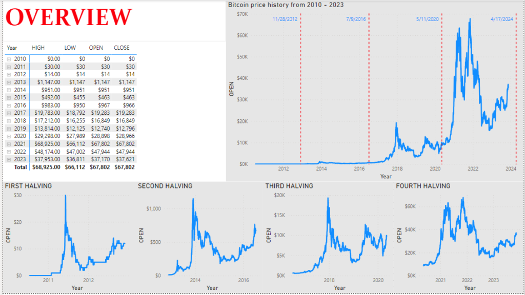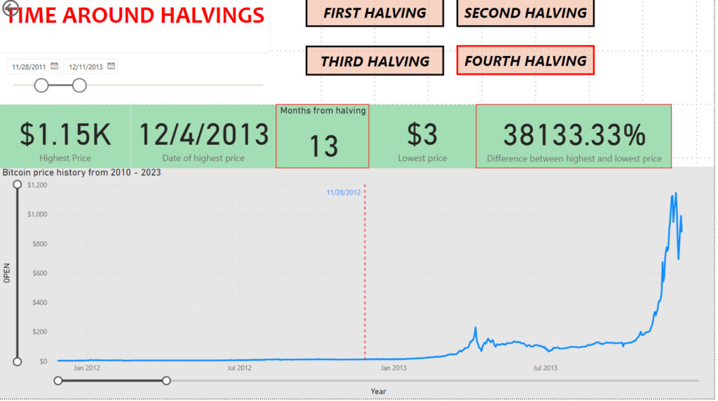 After that I created my final dashboard where I analyzed the 2 years following each Bitcoin halving. I did it in a similar way as I did the previous 2 dashboards where you can jump through the halving times using the buttons and you will see in the visuals the highest price that was reached in that time, the months that passed between the last halving and the highest price, the lowest price, the % difference between lowest and highest price and the date of the highest price.