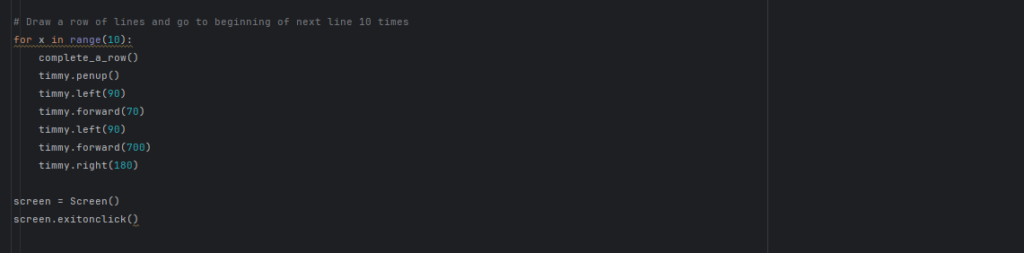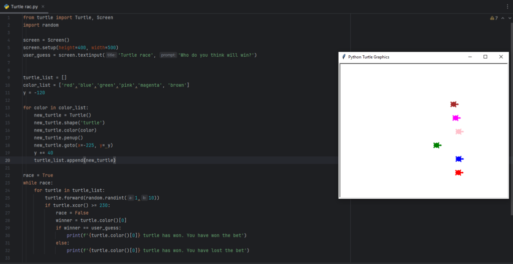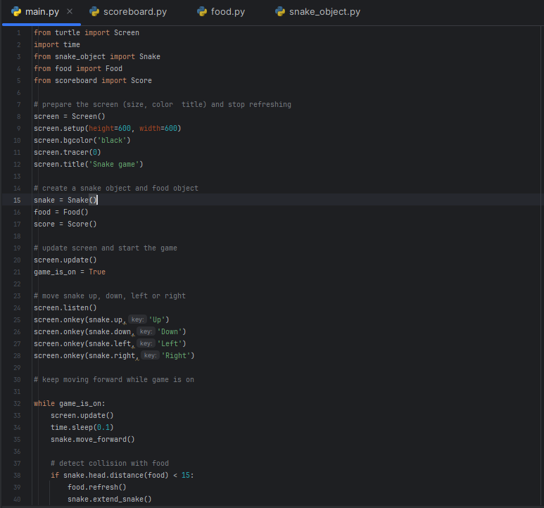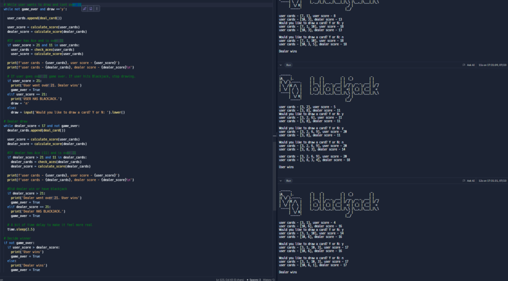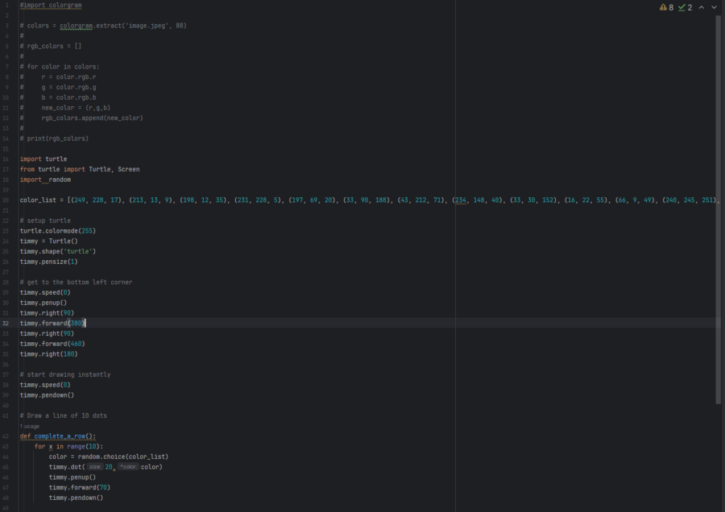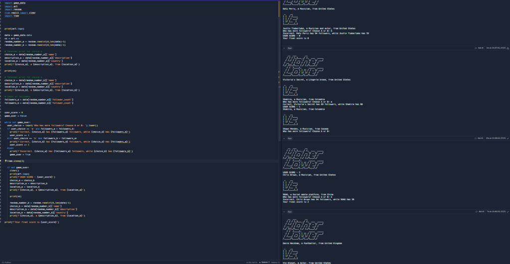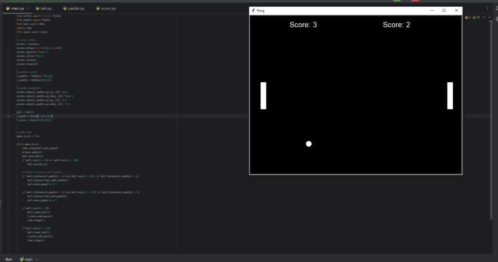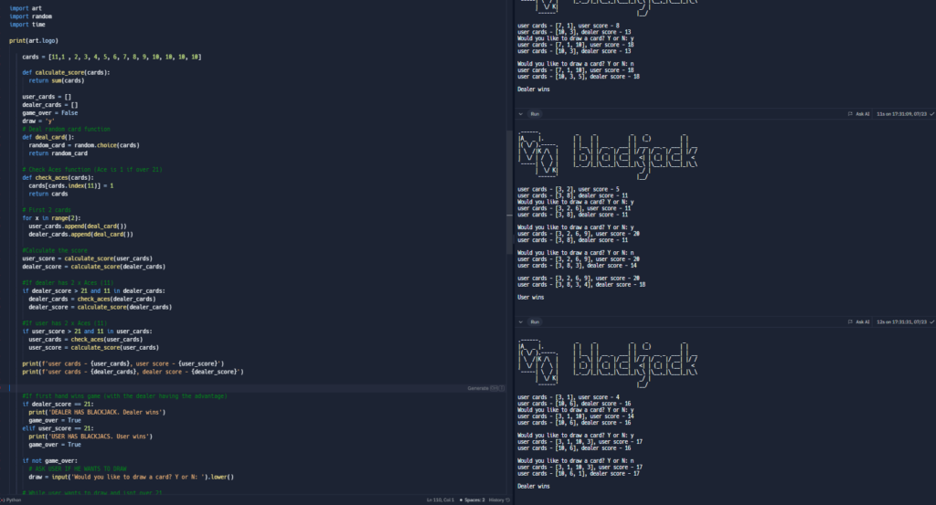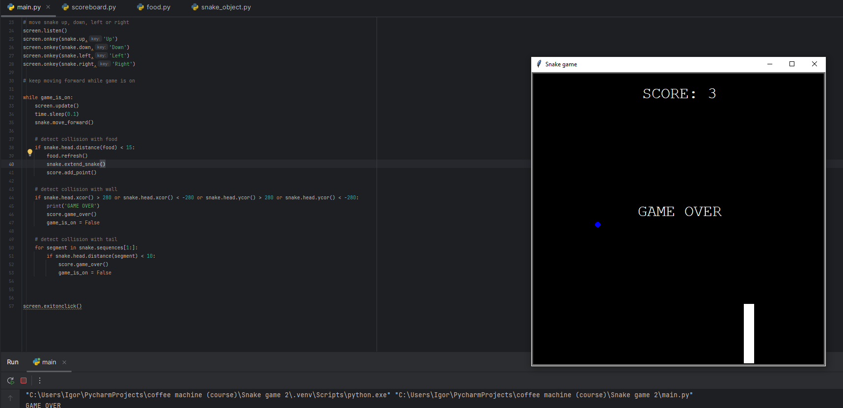 PROJECTS PYTHON COURSE PROJECTS Currently I am using most of my free time to study and practice python. I am doing this using an Udemy course.Bellow you will find projects and skills that the course has covered so far and that I am practicing at the moment.LAST UPDATED – 25.8.2024 BEGINER PROJECTS I have created a few games and projects to practice these new skills. You can see the code in the pictures on the right.– NUMBERS GAME– CALCULATOR– HIGHER/LOWER GAME– HANGMAN– BLACKJACK INTERMEDIATE PROJECTS OBJECT ORIENTED PROGRAMINGPROJECT 1:HIRST PAINTINGhttps://github.com/Cadez123/Hirst_painting OBJECT ORIENTED PROGRAMINGPROJECT 2:TURTLE RACE GAMEhttps://github.com/Cadez123/Trutle_race_betting_game OBJECT ORIENTED PROGRAMINGPROJECT 3:SNAKE GAMEhttps://github.com/Cadez123/Snake_game OBJECT ORIENTED PROGRAMINGPROJECT 4:PONG GAMEhttps://github.com/Cadez123/Pong_game TKINTERPROJECT:PASSWORD MANAGERhttps://github.com/Cadez123/Password_manager MORE PROJECTS COMING