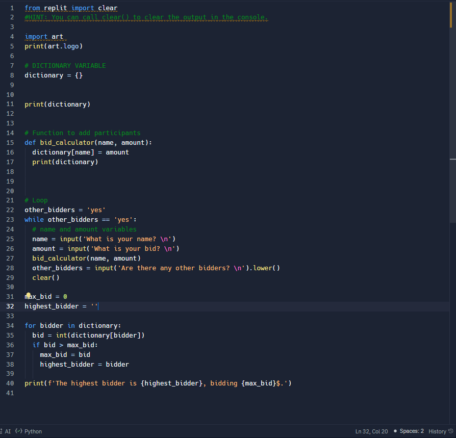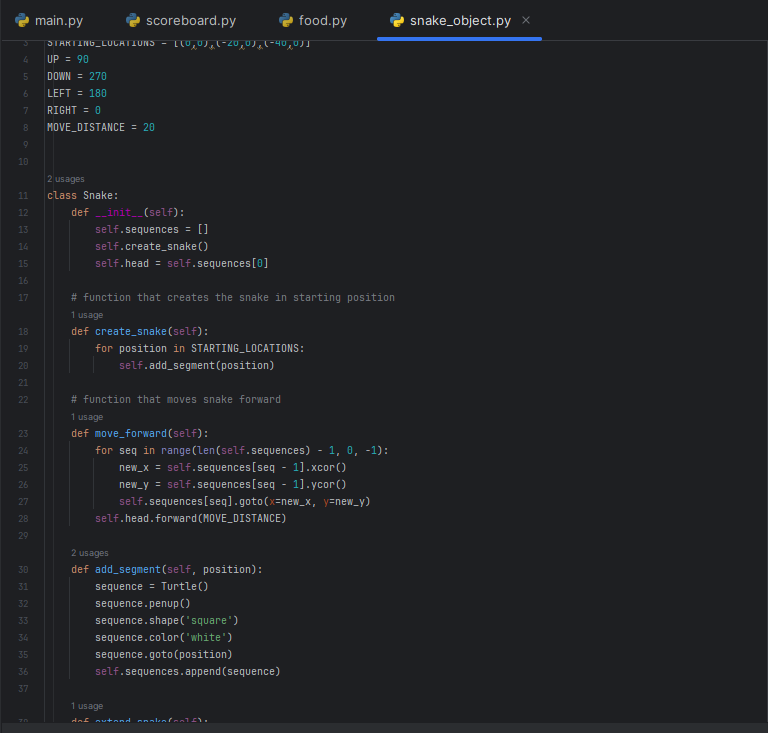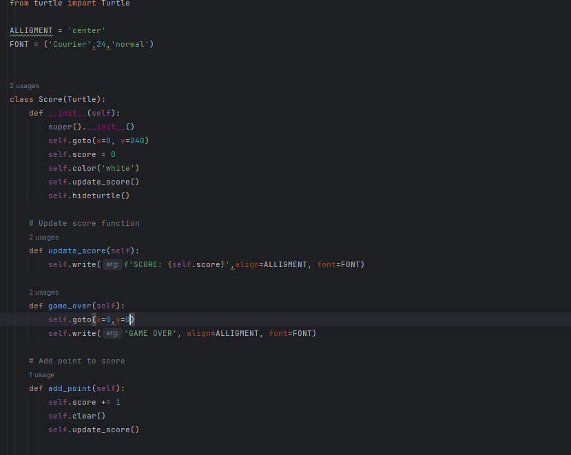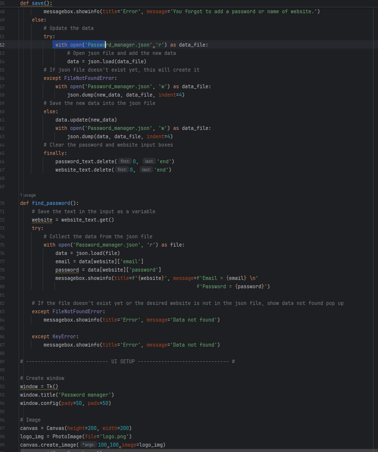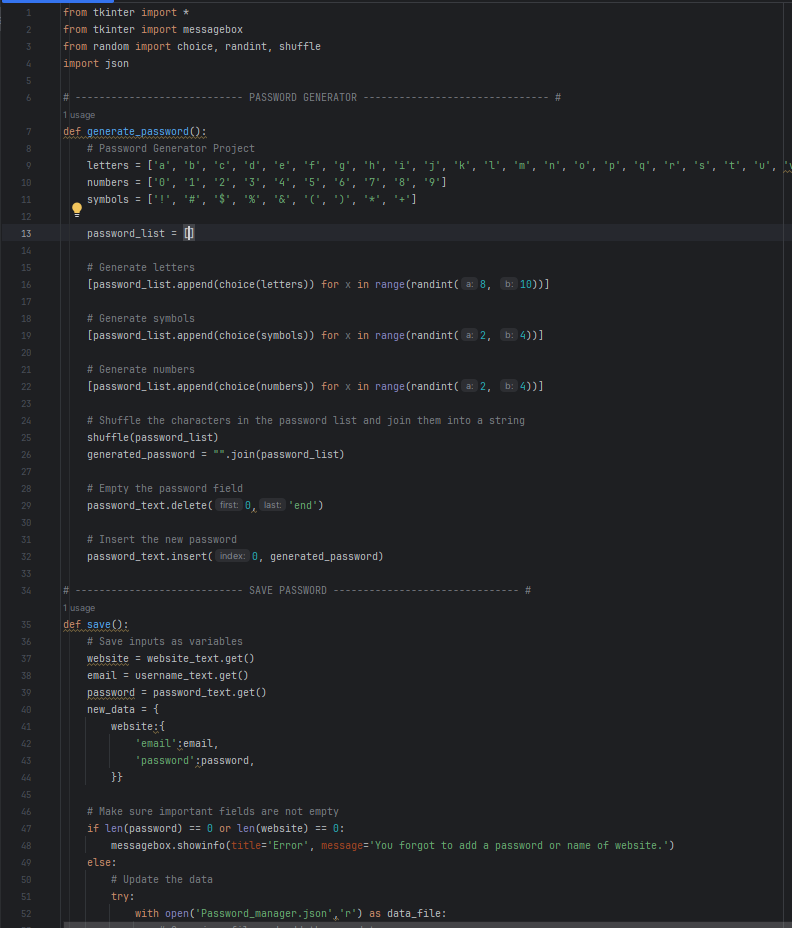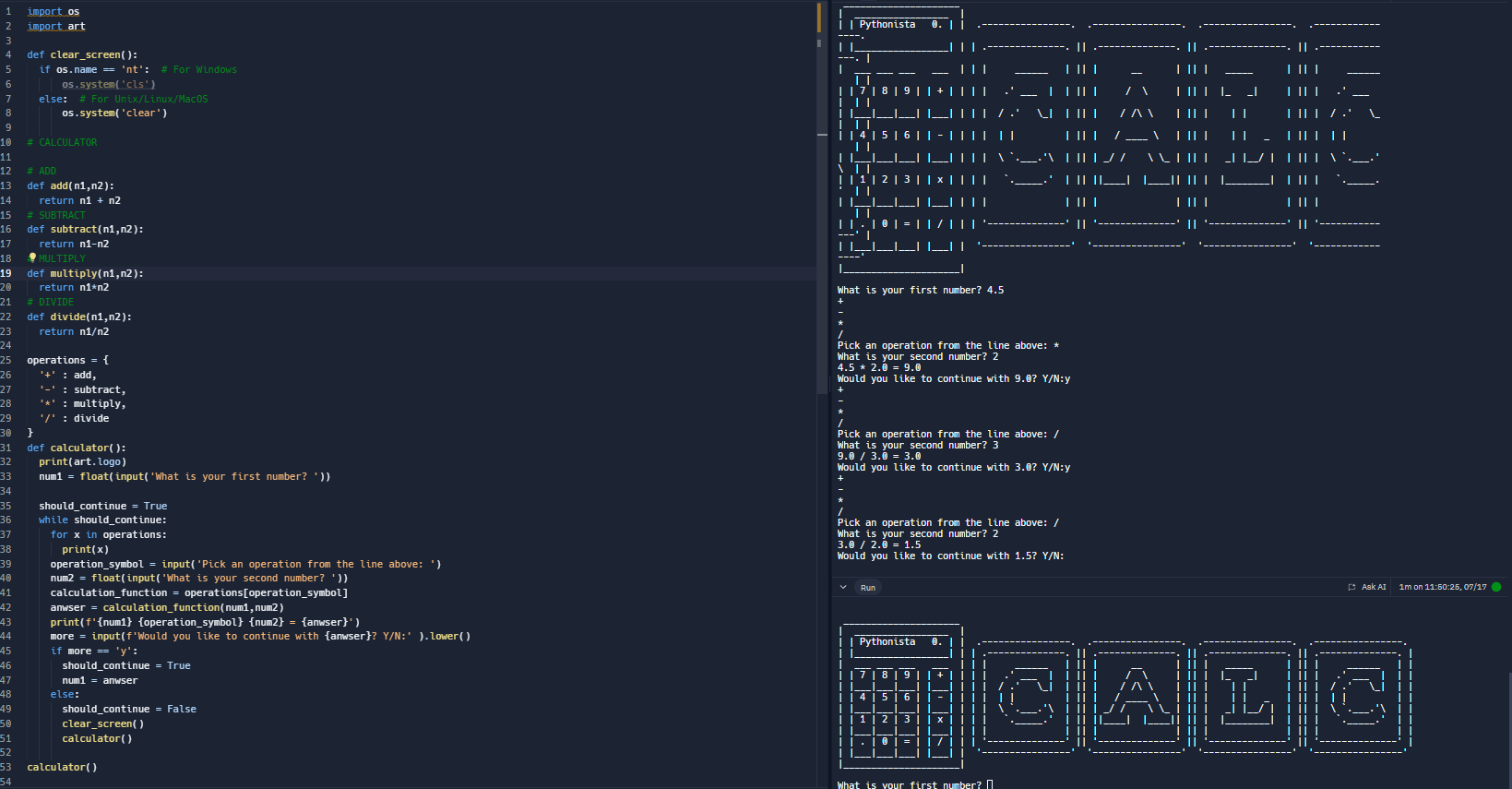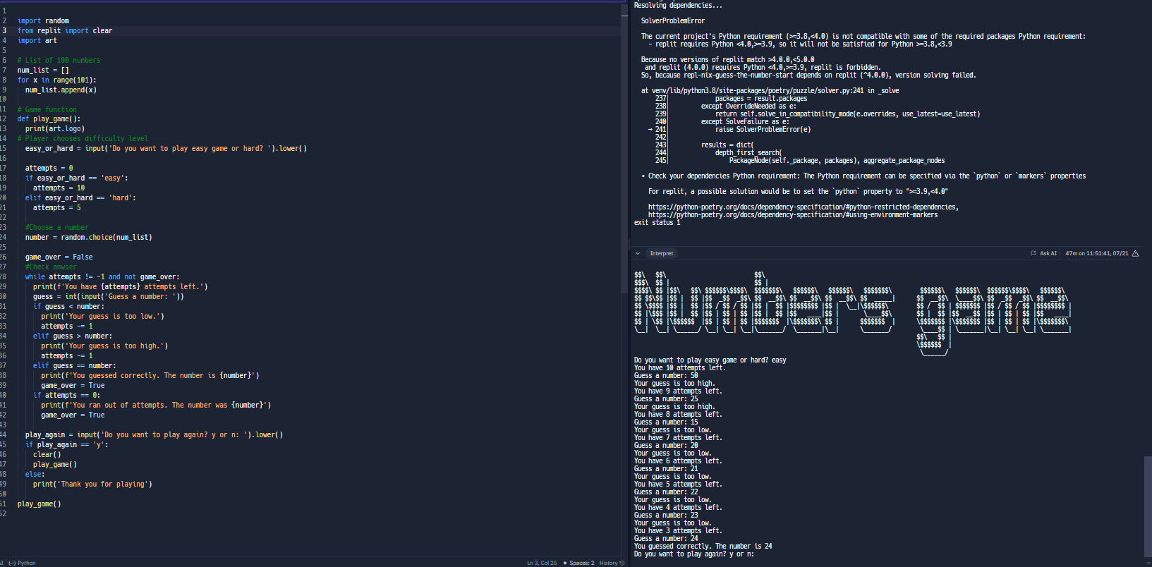 PROJECTS PYTHON COURSE PROJECTS Currently I am using most of my free time to study and practice python. I am doing this using an Udemy course.Bellow you will find projects and skills that the course has covered so far and that I am practicing at the moment.LAST UPDATED – 25.8.2024 BEGINER PROJECTS I have created a few games and projects to practice these new skills. You can see the code in the pictures on the right.– NUMBERS GAME– CALCULATOR– HIGHER/LOWER GAME– HANGMAN– BLACKJACK INTERMEDIATE PROJECTS OBJECT ORIENTED PROGRAMINGPROJECT 1:HIRST PAINTINGhttps://github.com/Cadez123/Hirst_painting OBJECT ORIENTED PROGRAMINGPROJECT 2:TURTLE RACE GAMEhttps://github.com/Cadez123/Trutle_race_betting_game OBJECT ORIENTED PROGRAMINGPROJECT 3:SNAKE GAMEhttps://github.com/Cadez123/Snake_game OBJECT ORIENTED PROGRAMINGPROJECT 4:PONG GAMEhttps://github.com/Cadez123/Pong_game TKINTERPROJECT:PASSWORD MANAGERhttps://github.com/Cadez123/Password_manager MORE PROJECTS COMING