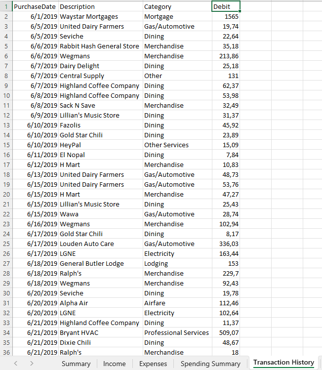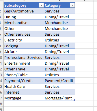 the tables and not just rows and columns. After that I imported a new categories table and used it in the Transaction History table