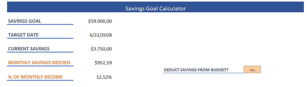 4. Next I created a savings calculator sheet where I calculated how much monthly savings I would need to reach a specific savings goal.