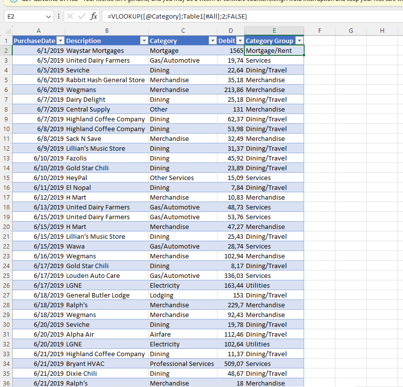 After this is done I move the updated data to my Transaction History table which automaticaly populates the Category Group column and